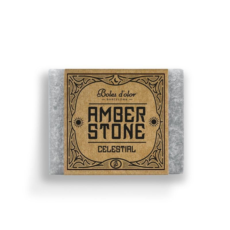 Cera aromática Amber Stone Celestial de Boles d'olor Barcelona, ideal para perfumar espacios con un aroma celestial y sofisticado. Presentada en una elegante caja rectangular con etiqueta de cartón decorada con motivos florales y solares. Perfecta para amantes de fragancias naturales y ambientación hogareña de calidad.