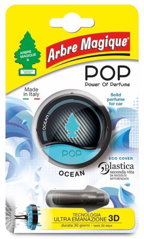Ambientador para coche Arbre Magique POP Ocean, con tecnología 3D para una difusión intensa y duradera durante 30 días. Diseño moderno con textura de fibra de carbono y aroma fresco de océano. Fabricado en Italia, con envase ecológico de plástico reciclado. Ideal para mantener el interior del vehículo perfumado y agradable.