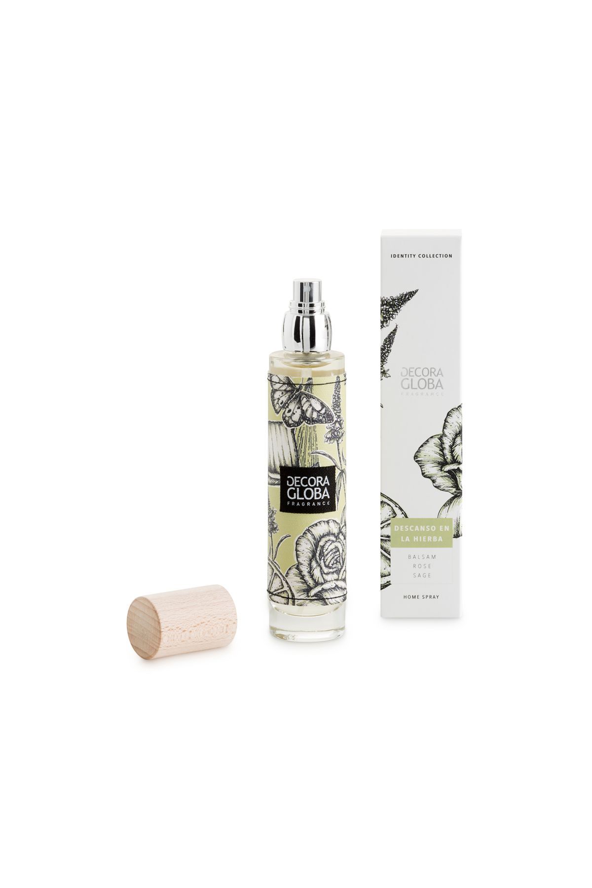 Ambientador hogar spray Descanso en la Hierba de 100 ml de Decoragloba, con un elegante frasco de vidrio y diseño floral en tonos verdes y negros. Ideal para perfumar espacios con un aroma fresco y natural. Incluye caja rectangular con diseño de hojas verdes y tapón de madera. Perfecto para crear un ambiente relajante en casa.
