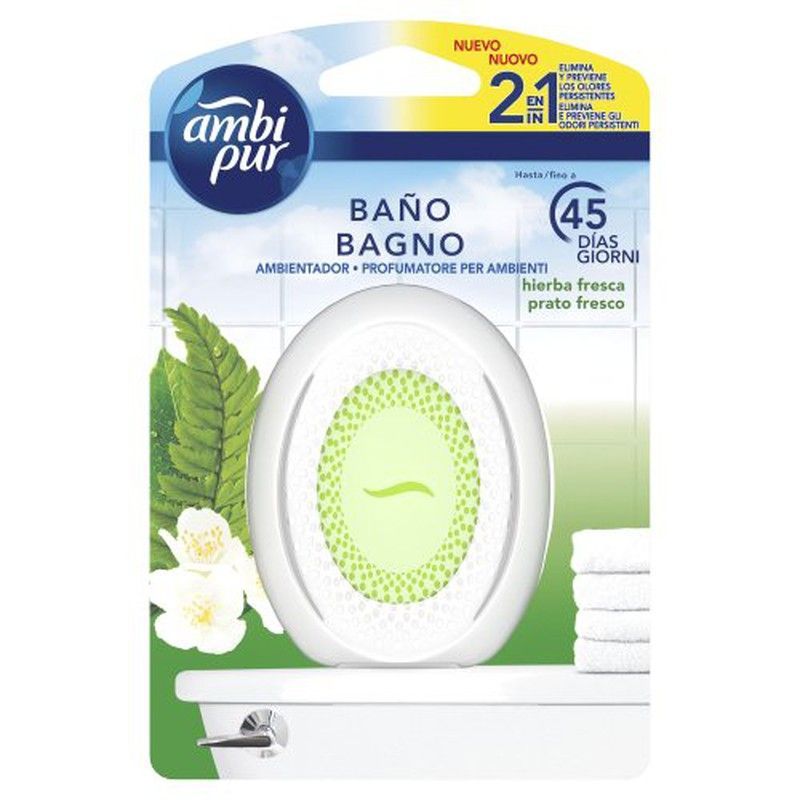 Ambipur Baño Hierba Fresca: ambientador para baño en formato 2 en 1 que elimina olores y perfuma el espacio hasta 45 días. Con diseño ovalado y textura perforada, ofrece una fragancia fresca y natural ideal para mantener el baño limpio y agradable. Embalaje con diseño de hoja verde y flores blancas, perfecto para cualquier hogar.