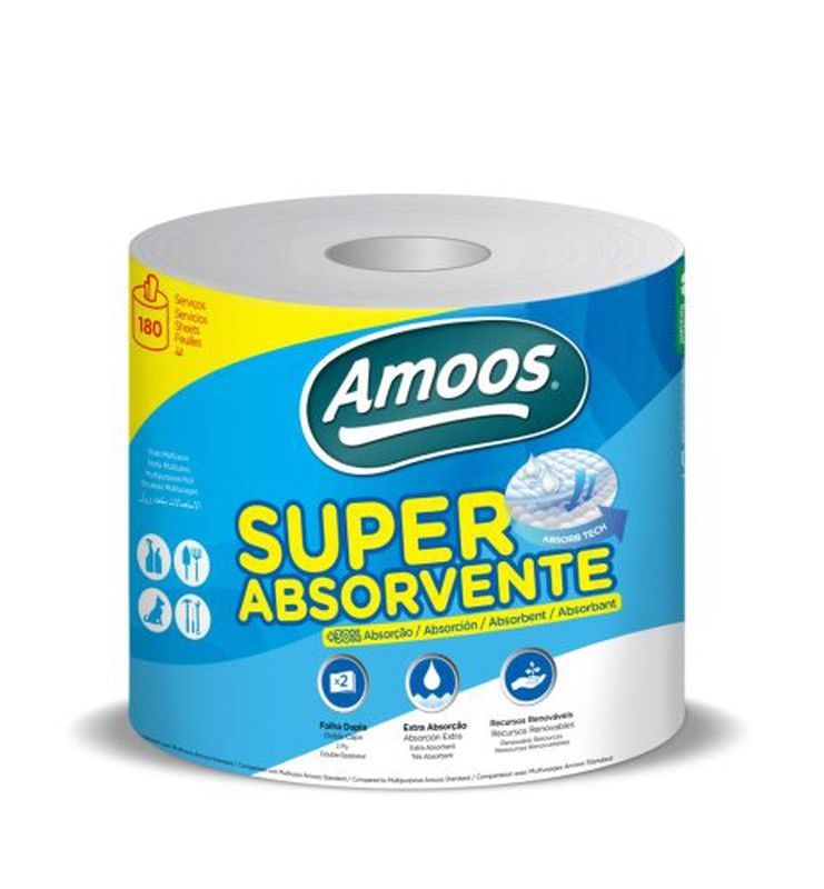 Rollo de papel higiénico Amoos Super Absorbente, ideal para uso diario en el hogar. Con tecnología Absorb Tech, ofrece alta absorción y suavidad. Contiene 180 hojas de doble capa para mayor resistencia y comodidad. Perfecto para mantener la higiene con calidad y eficiencia.