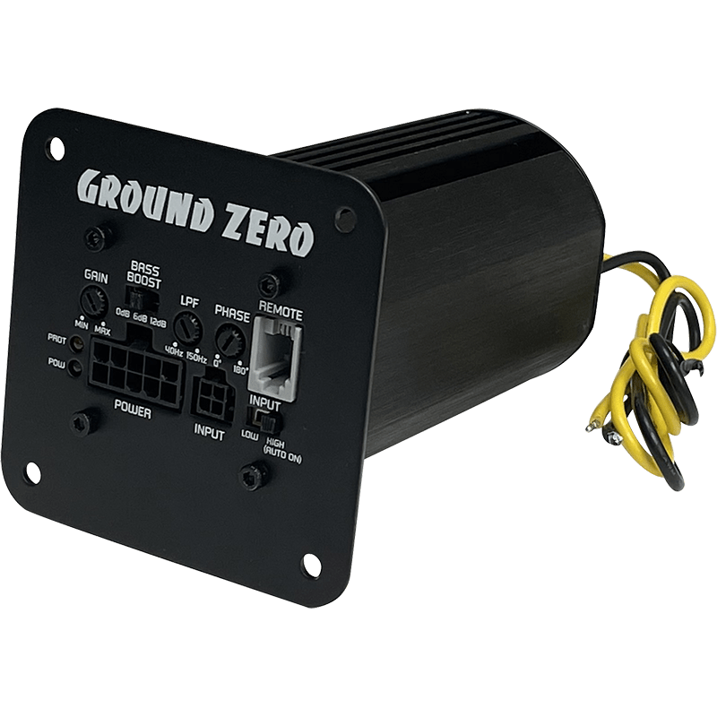 Amplificador compacto GROUND ZERO GZ SUB-AMP 300 de clase D, ideal para sistemas de audio en vehículos. Con 330 W RMS, ofrece potencia y calidad de sonido para cajas de subwoofer. Fabricado en metal y plástico, cuenta con controles precisos de ganancia, filtro paso bajo y fase. Incluye cable de conexión amarillo con pinzas para batería. Perfecto pa