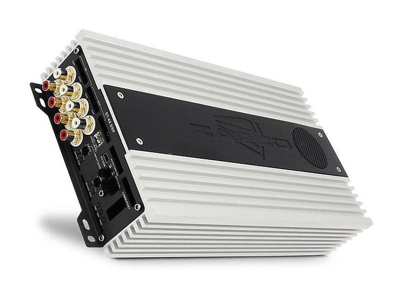 Amplificador de 4 canales de alta gama con DSP, ideal para sistemas de audio en vehículos. Potencia de 4 x 65 vatios a 4Ω. Diseño robusto en metal con disipador de calor eficiente y conectores RCA dorados para una señal de alta calidad. Perfecto para mejorar el sonido en coches y camiones.