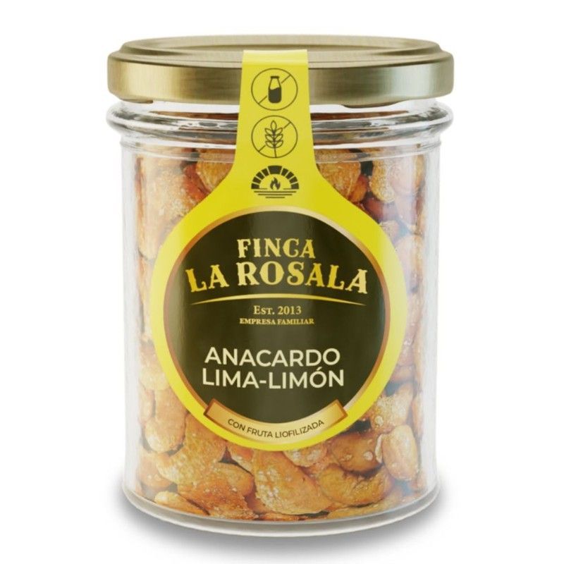 Anacardos Lima-Limón de Finca La Rosala, en tarro de 90 grs. Frutos secos tostados con sabor a lima y limón, ideales como snack saludable y gourmet. Producto de empresa familiar desde 2013, con fruta deshidratada. Perfecto para disfrutar en cualquier momento del día.