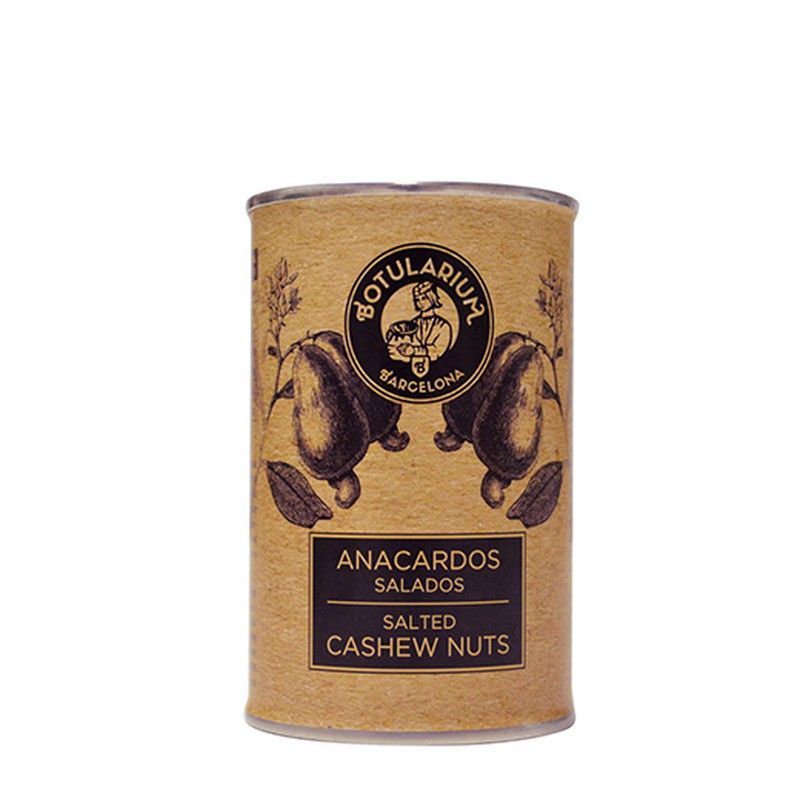 Anacardos salados de 130 grs en elegante envase de cartón con diseño vintage de Botularium Barcelona. Perfectos como snack saludable y gourmet, ideales para disfrutar en cualquier momento del día. Con un toque de sal que realza su sabor natural, son una opción ideal para amantes de los frutos secos de calidad.