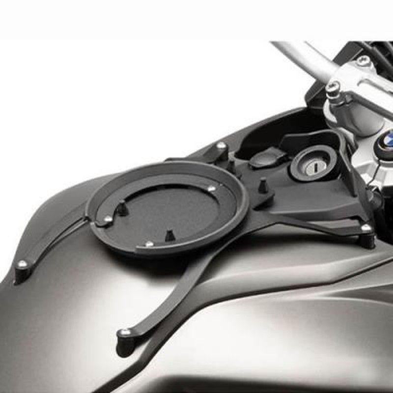 Anclaje Tanklock Givi BF15 para motocicletas BMW, fabricado en plástico resistente y metal de alta calidad. Diseño ergonómico para una fijación segura y estable de maletas o equipajes. Ideal para viajes largos y uso diario. Fácil instalación directa sobre el tanque con sistema de tornillos. Incluye tapa circular con bisagras para protección y estét