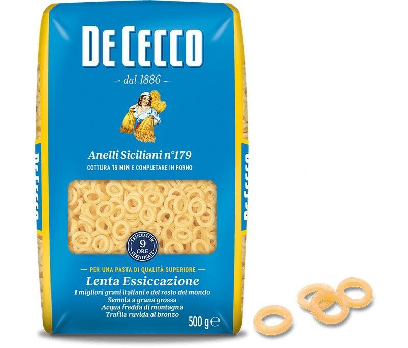 Anelli Siciliani n°179 de De Cecco, pasta italiana de calidad superior en envase de 500 g. Con lenta essiccazione y trafilatura en bronce, ideal para cocinar 15 minutos y terminar en horno. Perfecta para amantes de la pasta auténtica con sabor tradicional siciliano.