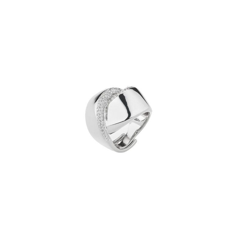 Anillo Sovrani J9708M12 en latón plateado con circonitas incrustadas, diseño moderno y sofisticado. Ideal para adultos que buscan un accesorio elegante y versátil para complementar su estilo diario o ocasiones especiales. Acabado brillante y detalles pulidos que resaltan su calidad.