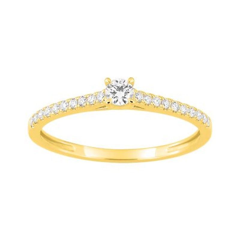 Anillo de oro de 9 quilates con diamantes de laboratorio de 0,21 ct. Diseño elegante con diamante central y banda pavé. Ideal para mujeres que buscan joyería fina y sofisticada. Perfecto como anillo de compromiso o joya de ocasión especial.
