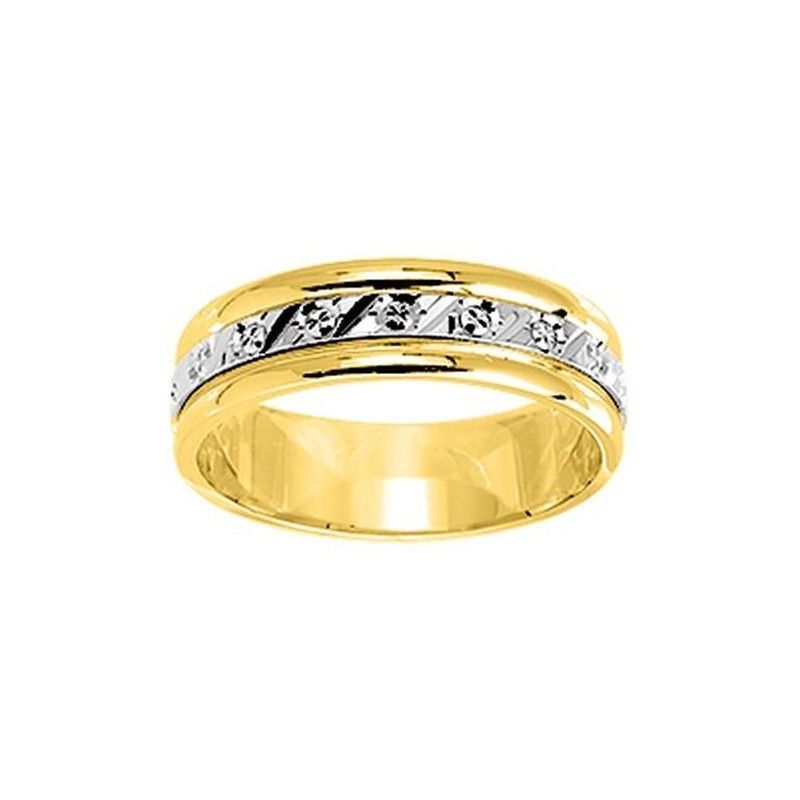 Anillo de oro bicolor 18k con diamantes, ideal para parejas o como joya de compromiso. Combina oro amarillo y blanco con una elegante fila de diamantes en la parte superior. Diseño clásico y sofisticado, acabado pulido y ancho de 5,5 mm. Perfecto para ocasiones especiales o uso diario. Calidad premium, fabricado con materiales nobles.