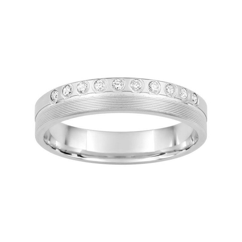 Elegante anillo de oro blanco de 18 quilates con 10 diamantes de 0,10 ct en total, ideal para parejas que buscan un diseño sofisticado y clásico. Con acabado pulido y detalles de surcos horizontales, este anillo de alianza combina elegancia y durabilidad. Perfecto como anillo de compromiso o boda para adultos que valoran la calidad y el estilo.