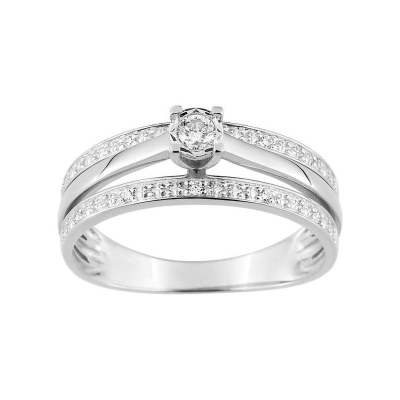 Anillo de oro blanco 18kts con diamante central y banda pavé, ideal para ocasiones especiales. Diseño elegante con doble banda entrelazada y acabado pulido. Joya de alta calidad para mujeres que buscan sofisticación y brillo. Perfecto como anillo de compromiso o regalo exclusivo.