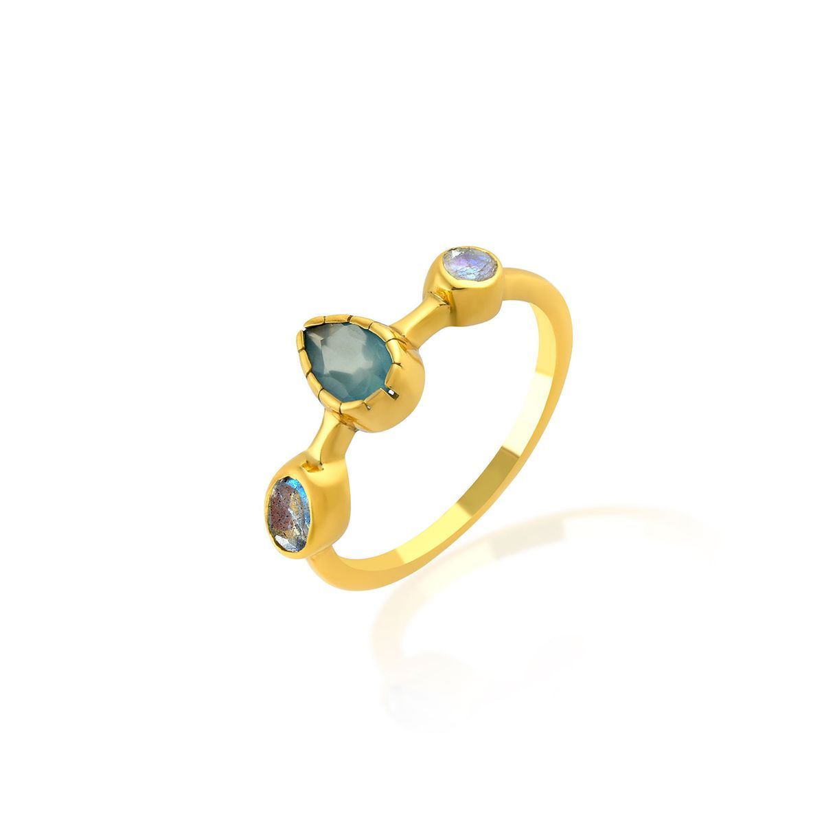 Anillo de plata dorada con tres piedras minerales azules, ideal para mujeres que buscan un toque de elegancia y sofisticación. Diseño minimalista y moderno, perfecto para combinar con cualquier atuendo. Fabricado con acabado dorado de alta calidad, este anillo es una joya versátil para diario o ocasiones especiales.