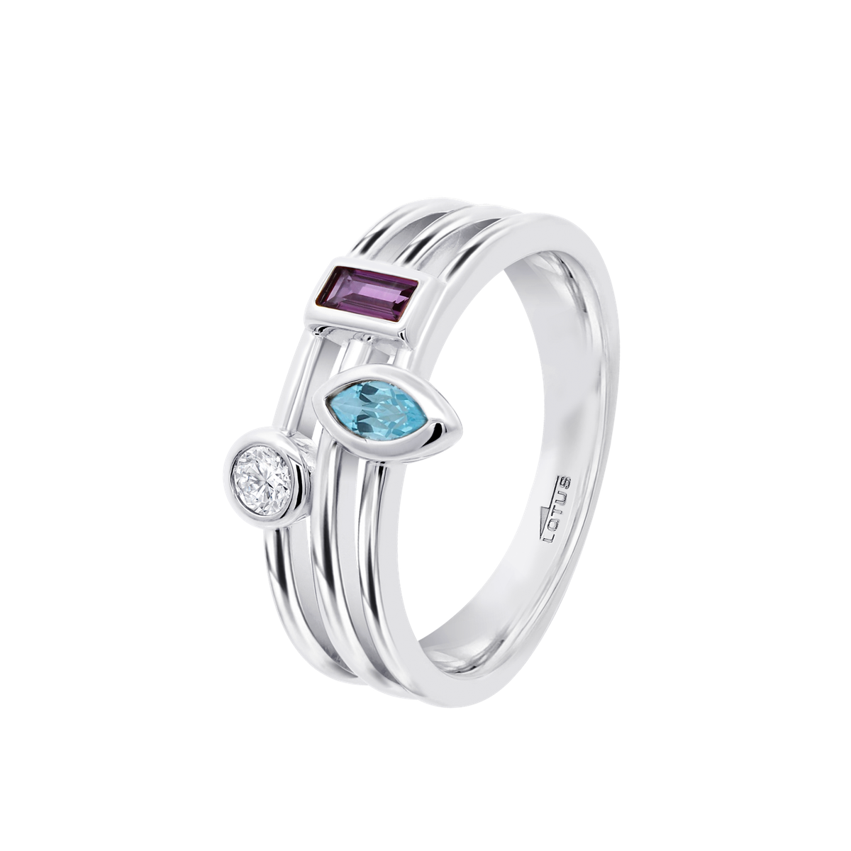 Anillo Lotus LP3882-3/112 en plata con circonitas multicolor. Diseño sofisticado con tres piedras: una rectangular morada, una ovalada azul y una redonda transparente. Ideal para mujeres que buscan joyería elegante y moderna. Perfecto para usar diariamente o en ocasiones especiales. Calidad premium y acabado pulido que resalta la belleza de las pie