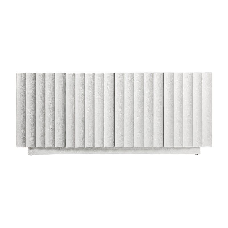 Aparador de comedor en cemento blanco, con diseño moderno y paneles verticales cilíndricos. Ideal para espacios contemporáneos, ofrece estilo industrial con acabado elegante. Dimensiones: 180 x 40 x 77 cm. Perfecto para almacenamiento funcional y decoración sofisticada en tu hogar.