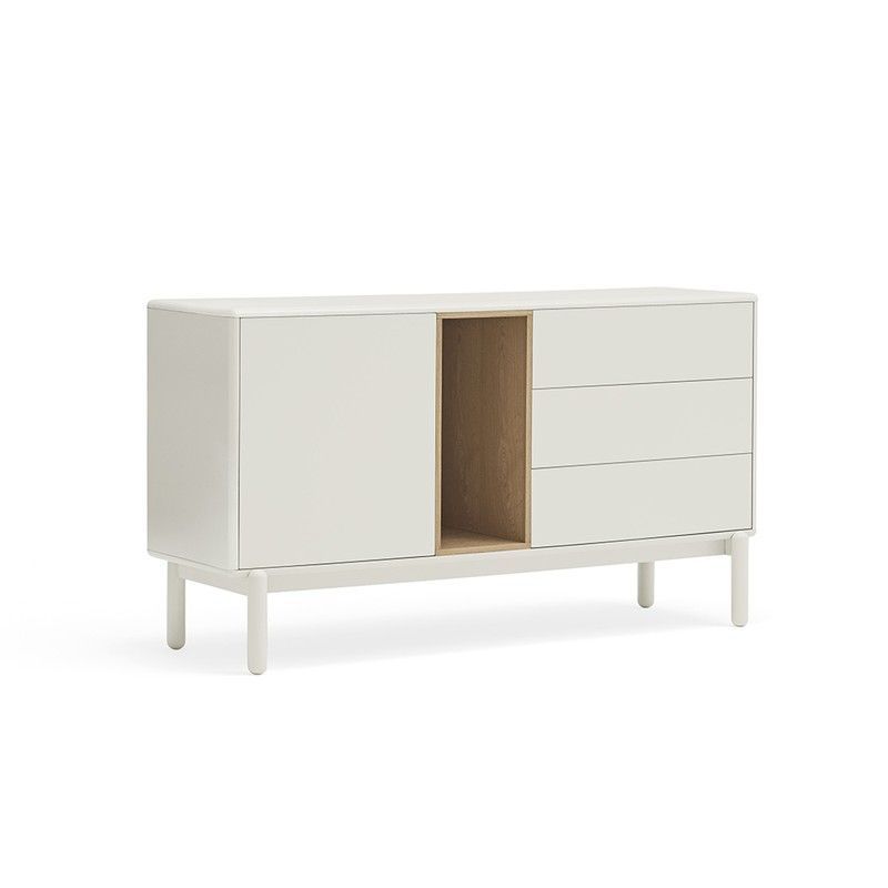 Aparador Corvo de madera en tono crema, ideal para el comedor o salón. Con diseño moderno y funcional, cuenta con una puerta corredera y tres cajones para un almacenamiento ordenado. Patas delgadas que aportan ligereza al mueble. Perfecto para espacios contemporáneos que buscan estilo y practicidad.