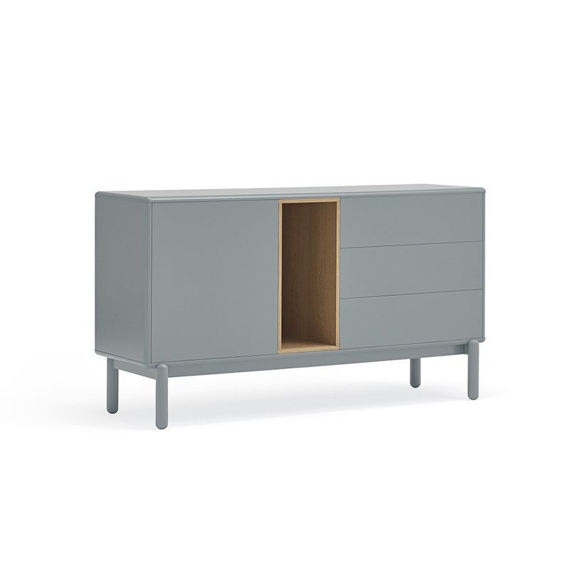 Aparador Corvo en gris perla, ideal para el comedor o salón. Con dimensiones de 136,8 x 40 x 76 cm, combina elegancia y funcionalidad. Fabricado en madera, cuenta con tres cajones y una puerta abierta que revela interior de madera clara. Patas delgadas y diseño minimalista para un toque contemporáneo en tu hogar.