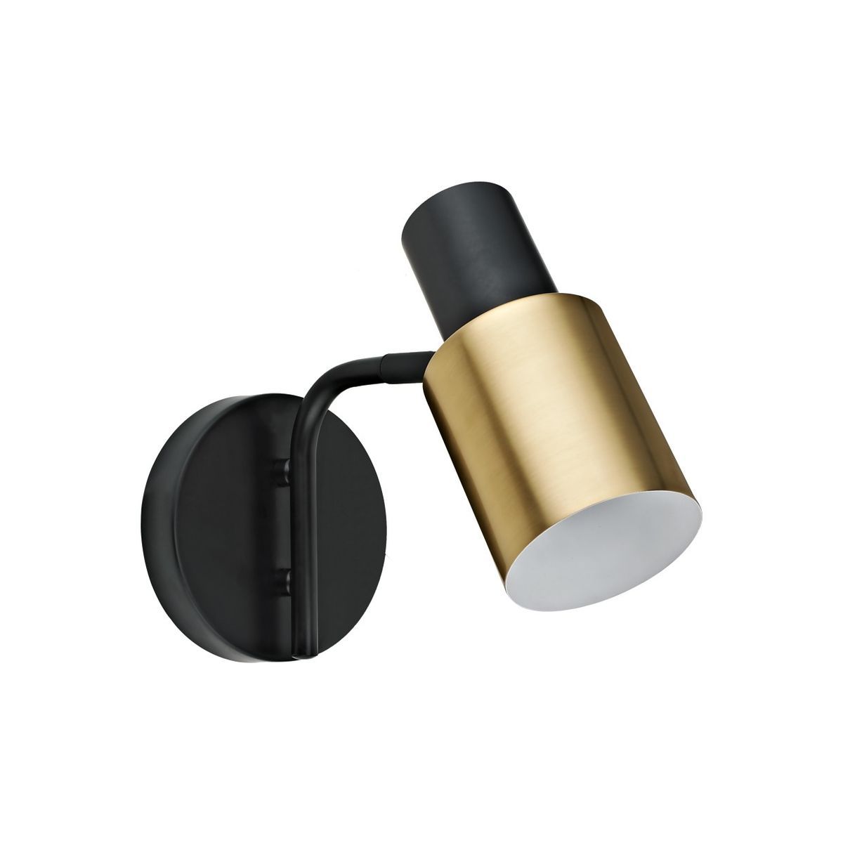 Aplique de pared Maena en acabado negro y dorado, ideal para espacios modernos. Fabricado en metal de alta calidad, cuenta con pantalla interior blanca para una iluminación suave y direccional. Perfecto para pasillos, dormitorios o salas, con ajuste de ángulo para enfocar la luz según necesites. Incluye soporte circular negro y brazo flexible. Dise