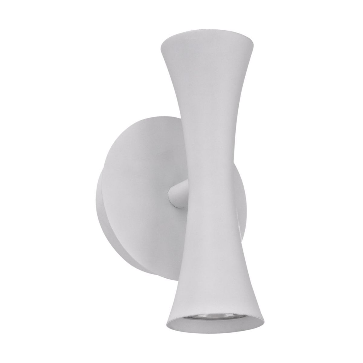Aplique de pared Alda en blanco, diseño moderno y elegante con forma de trompeta invertida. Ideal para iluminar pasillos, escaleras o espacios interiores con estilo. Fabricado en plástico y metal de alta calidad, con dos focos GU-10 orientables hacia arriba y abajo. Perfecto para ambientes contemporáneos que buscan funcionalidad y diseño.