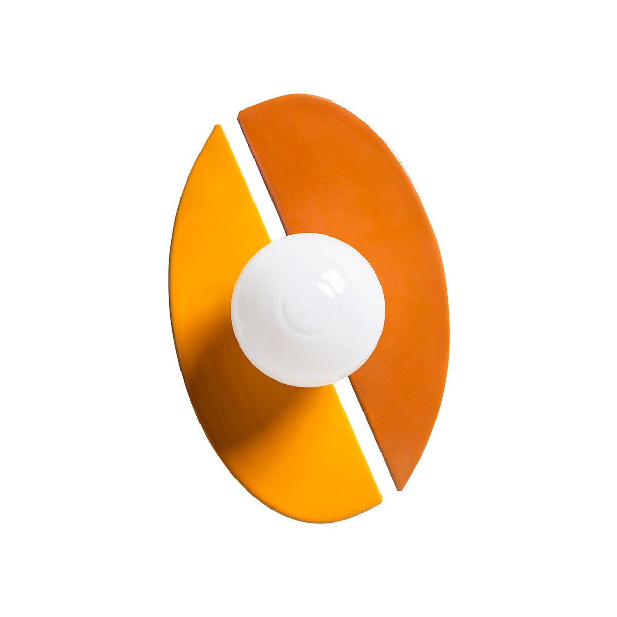Aplique de pared Arco en metal, con diseño ovalado y colores naranja y amarillo, ideal para iluminar espacios con estilo moderno. Su esfera blanca central alberga la bombilla, creando un efecto visual único. Perfecto para salones, pasillos o dormitorios. Dimensiones: 20 x 15 x 31 cm.