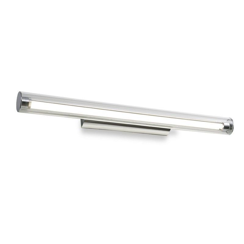 Aplique de pared MB1116-18W Lumiere, diseño moderno y minimalista con acabado plateado y tubo de vidrio transparente. Fabricado en acero inoxidable y vidrio, ideal para baños, vestidores o espacios con estilo contemporáneo. Iluminación eficiente y elegante para cualquier ambiente.