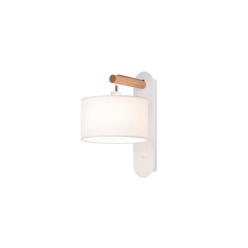 Aplique de pared MB2116-WH Lumiere con pantalla de tela blanca y detalles en madera, ideal para espacios modernos. Diseño minimalista con acabado metálico blanco, perfecto para iluminar pasillos, dormitorios o salas con estilo. Combina funcionalidad y elegancia en un solo producto.