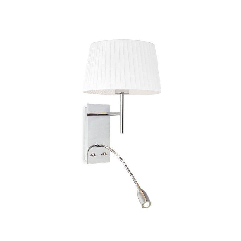 Aplique de pared MB5121-W Lumiere con pantalla blanca plisada y estructura en acero inoxidable plateado. Incluye luz LED ajustable con brazo flexible para iluminación direccional. Ideal para dormitorios, salas o pasillos. Diseño moderno y funcional para espacios elegantes.