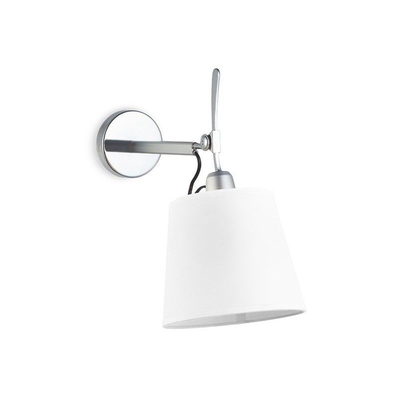 Aplique de pared MB8617A-W Lumiere con diseño moderno y acabado plateado. Ideal para iluminar espacios como pasillos, dormitorios o salas. Cuenta con brazo articulado y difusor cónico de tela blanca para una luz suave y dirigida. Fabricado en metal y textil de calidad, fácil de instalar y ajustar según necesidad.