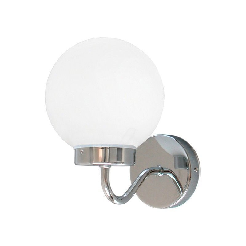 Aplique de pared TOGO con diseño esférico en cristal blanco opalino y estructura de metal cromado. Ideal para iluminar pasillos, baños o exteriores gracias a su protección IP44. Fácil instalación con base curva y acabado moderno. Perfecto para espacios con estilo contemporáneo.