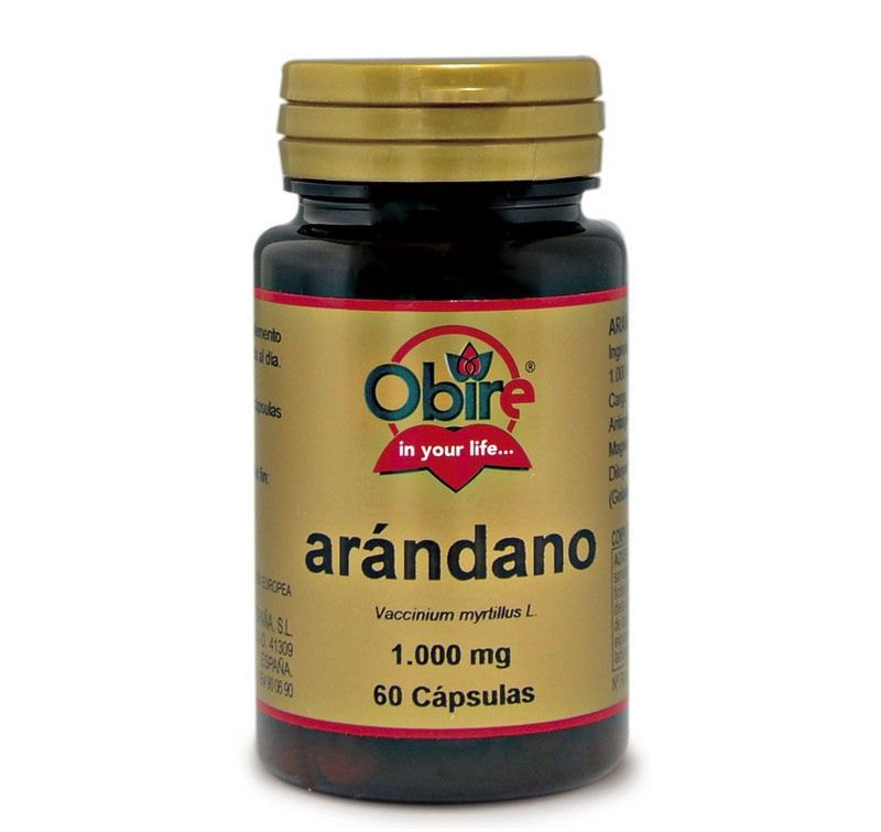 Suplemento de arándano 1.000 mg en 60 cápsulas de la marca Obire, ideal para apoyar la salud ocular y urinaria. Envasado en bote de vidrio oscuro con tapa dorada para proteger la calidad del producto. Perfecto para adultos que buscan un complemento natural y eficaz en su rutina diaria de salud.