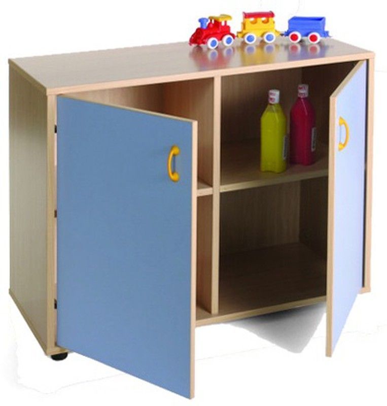 Armario infantil de madera con 4 casillas y 2 puertas azules, ideal para organizar juguetes y accesorios en habitaciones de niños. Diseño funcional y atractivo con asas amarillas en forma de C. Perfecto para espacios infantiles, fácil de usar y mantener. Incluye estantes internos para una organización óptima.