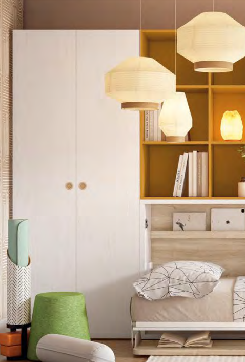 Armario Ros de 2 puertas con distribución ideal para habitaciones infantiles. Diseño moderno con acabado blanco y estantería amarilla integrada. Fabricado en madera y plástico, ofrece espacio para libros, juguetes y decoración. Incluye iluminación colgante y almacenamiento bajo cama. Perfecto para niños que buscan orden y estilo en su espacio.