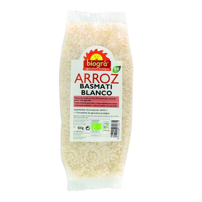 Arroz basmati blanco ecológico Biogra, 500g. Grano largo y aromático, ideal para platos exquisitos y saludables. Producido con agricultura ecológica, sin aditivos ni conservantes. Perfecto para cocinar arroces, guisos o como acompañamiento. Envase transparente que muestra el grano natural y puro. Ideal para amantes de la alimentación consciente y s