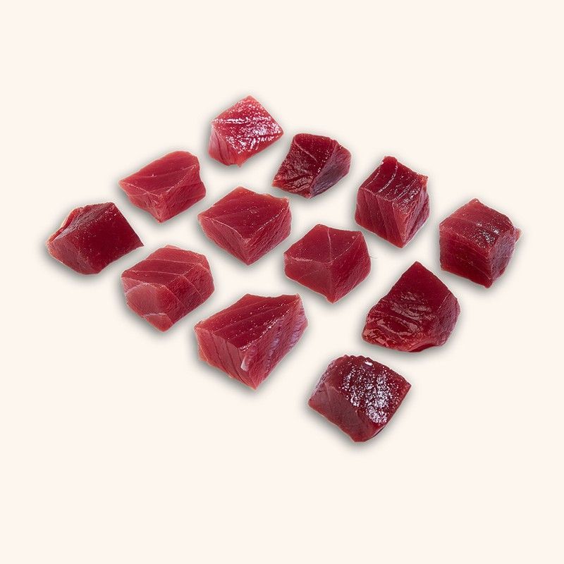 Deliciosa carne de atún rojo Bluefin en taquitos, perfecta para disfrutar en cualquier momento.