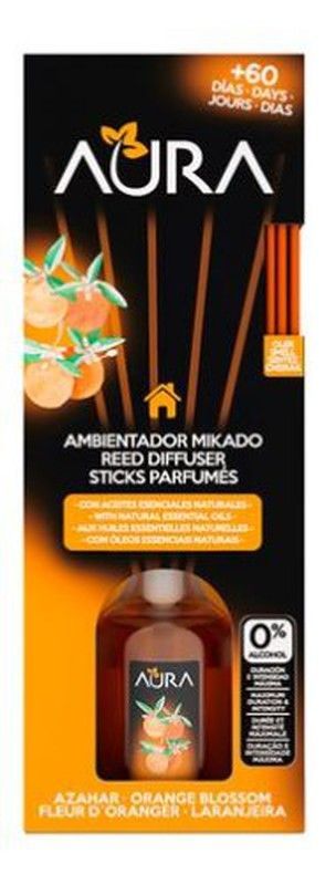 Ambientador Mikado Aura con aroma a azahar, ideal para perfumar tu hogar durante más de 60 días. Con aceites esenciales naturales y sin alcohol, este difusor de varillas ofrece una fragancia suave y duradera. Perfecto para salas, dormitorios o espacios pequeños. Embalaje elegante con diseño de naranjo y detalles en naranja y negro.
