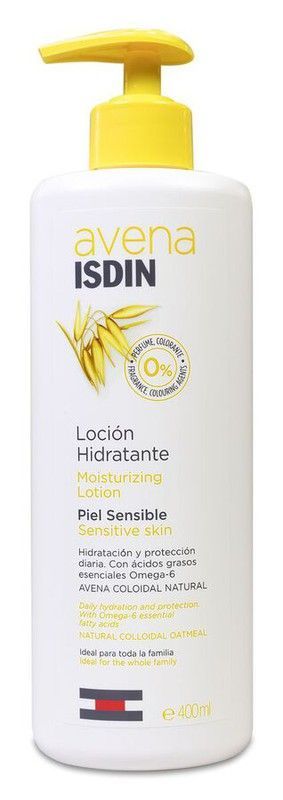 Loción hidratante Isdin Avena para piel sensible, ideal para toda la familia. Con avena coloidal natural y ácidos grasos esenciales Omega-6, ofrece hidratación diaria y protección. Sin perfume ni colorantes. En práctico envase de 400ml con dispensador. Perfecta para pieles sensibles y reactivas.