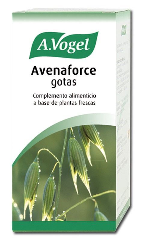 Avenaforce gotas de A.Vogel, un complemento alimenticio natural a base de plantas frescas, ideal para quienes buscan apoyo en su bienestar diario. Presentado en una caja rectangular con diseño verde y natural, este producto destaca por su formulación con avena fresca, sin aditivos artificiales. Perfecto para adultos que valoran la nutrición natural