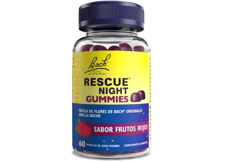 Bach Rescue Night Gummies, 60 pastillas de goma vegetales con sabor a frutos rojos. Formuladas con la mezcla original de flores de Bach para la noche, ayudan a relajarse y dormir mejor. Ideal para adultos que buscan apoyo natural para el descanso. Envase transparente con etiqueta amarilla y azul, fácil de usar y portátil.