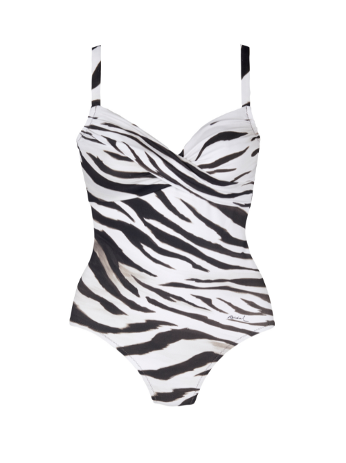 Bañador Roidal NIAGARA 'C' con escote cruzado y estampado animal print en blanco y negro. Diseño elegante y ajustado, ideal para un look sofisticado en la playa o la piscina. Confeccionado en poliéster de alta calidad para mayor durabilidad y comodidad. Perfecto para mujeres que buscan estilo y funcionalidad en su traje de baño.