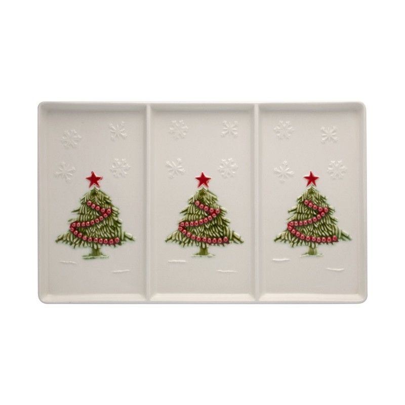 Bandeja de loza con 3 divisiones, ideal para servir dulces, frutas o aperitivos en Navidad. Diseño festivo con árboles de Navidad verdes adornados con bolas rojas y estrellas, sobre fondo blanco con copos de nieve en relieve. Hecha de loza de calidad, perfecta para decorar tu mesa en las fiestas. Dimensiones: 33,5 x 20,5 x 2 cm.