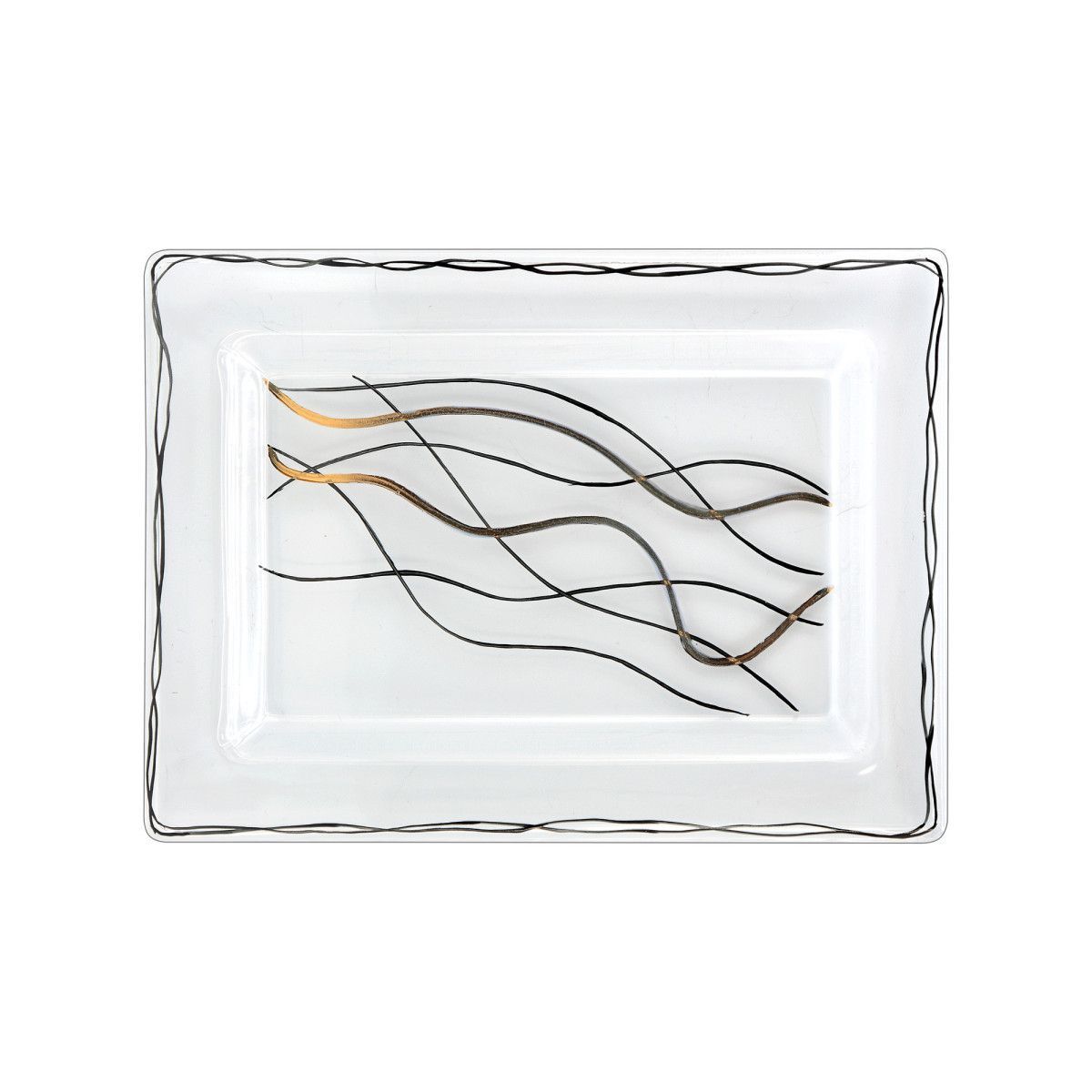 Bandeja de cristal de 24.5x18 cm con diseño abstracto de líneas onduladas en negro y dorado, decorada a mano. Ideal para servir aperitivos, postres o como pieza decorativa en tu mesa. Su acabado elegante y detalles artesanales la convierten en un accesorio sofisticado para cualquier ocasión. Hecha de cristal de alta calidad, resistente y fácil de l