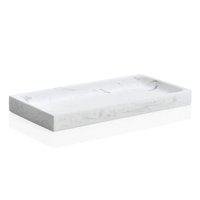 Bandeja de poliresina en blanco y gris con diseño imitación mármol, ideal para decorar el baño o como accesorio de tocador. Con dimensiones de 25,5 x 12 x 2 cm, ofrece un toque sofisticado y funcional para tu hogar. Resistente y fácil de limpiar, perfecta para organizar productos de higiene o como elemento decorativo.