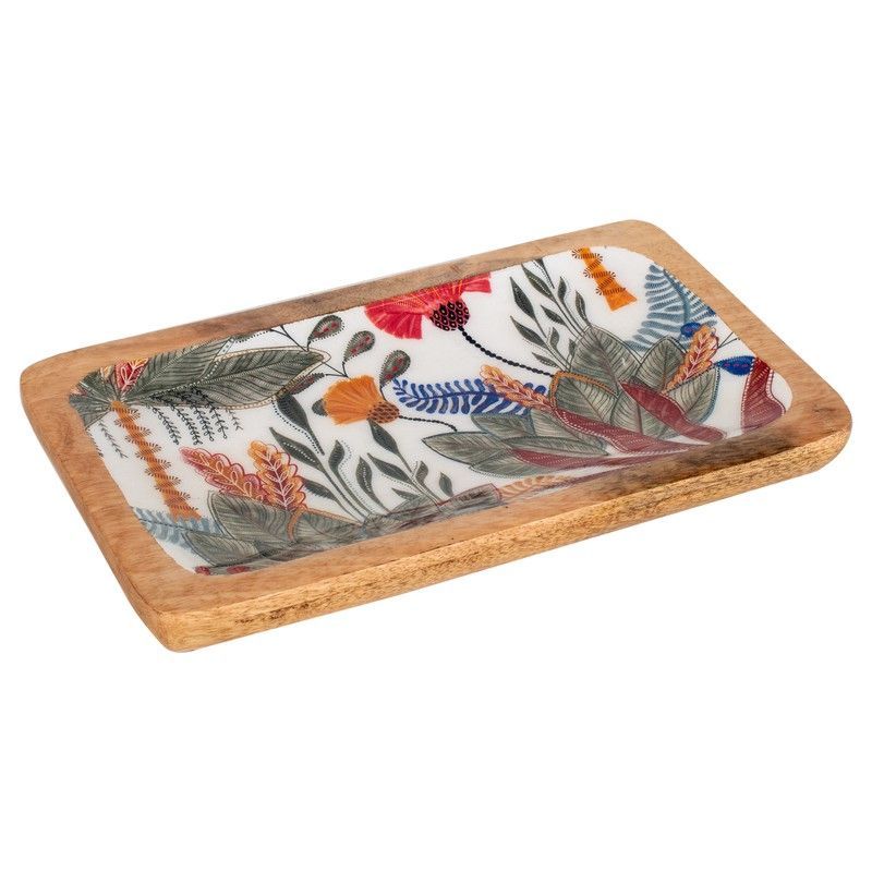 Bandeja decorativa mediana con diseño tropical de hojas y flores en colores vivos sobre fondo blanco, con borde de madera natural. Ideal para decorar mesas, servir dulces o como elemento decorativo en casa. Hecha con cerámica y madera de calidad, combina estilo y funcionalidad para espacios modernos y acogedores.