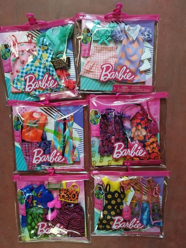 Pack de ropa y accesorios para muñeca Barbie con 2 looks de moda surtidos. Ideal para niñas que aman vestir a sus muñecas con estilo. Cada paquete incluye prendas con estampados variados como lunares, rayas y flores, en colores vibrantes. Embalaje transparente con cierre rosa para fácil visualización y almacenamiento. Perfecto para juegos de imagin