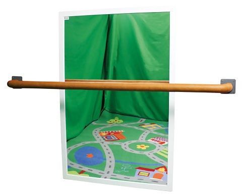 Barra estabilizadora de madera natural para niños, ideal para espacios de juego o desarrollo motor. Diseño seguro y funcional con soportes metálicos y fondo decorativo con carreteras y casas. Perfecta para habitaciones infantiles o áreas de juego. Fomenta la coordinación y el equilibrio en niños pequeños.