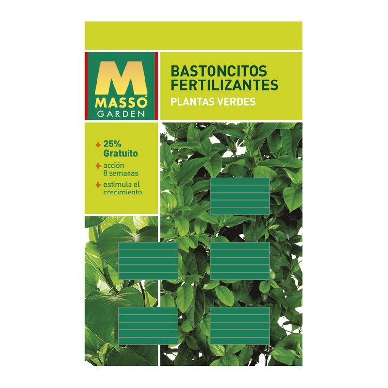 Bastoncitos fertilizantes para plantas verdes de Massó Garden, en caja rectangular con diseño de hoja verde. Ideal para estimular el crecimiento de tus plantas durante 8 semanas. Incluye 25% gratuito. Perfecto para jardinería en casa o balcones. Fácil de usar y eficaz.