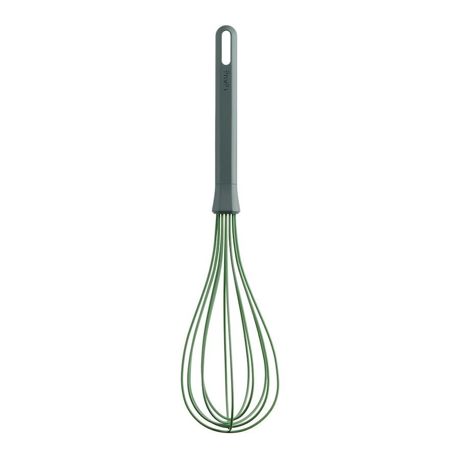 Batidor de varillas Lekue con manija ergonómica en gris y varillas de acero inoxidable con acabado verde. Ideal para batir huevos, mezclar ingredientes o montar claras. Diseño compacto y fácil de limpiar, perfecto para cocinas modernas. Calidad duradera y uso diario en la preparación de recetas.