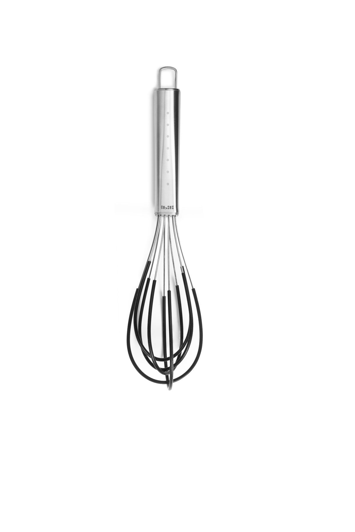 Batidor de silicona Intense con manija de acero inoxidable y filamentos de silicona negra. Diseño ergonómico y resistente, ideal para batir, mezclar y montar ingredientes en la cocina. Perfecto para uso diario en hogares y profesionales. Fácil de limpiar y duradero.