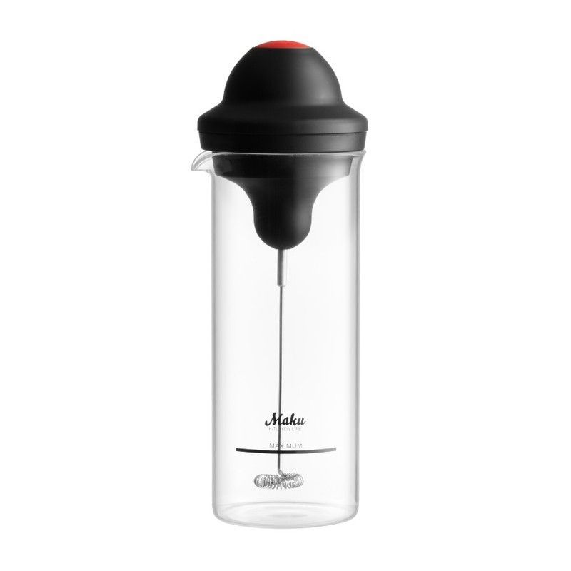 Batidora espuma eléctrica Maku con cuerpo de vidrio transparente y tapón negro con detalle rojo. Fabricada con materiales de calidad como plástico, acero inoxidable y vidrio, ideal para espumar leche, batir cremas o preparar bebidas frías. Diseño moderno y funcional para uso diario en cocina.