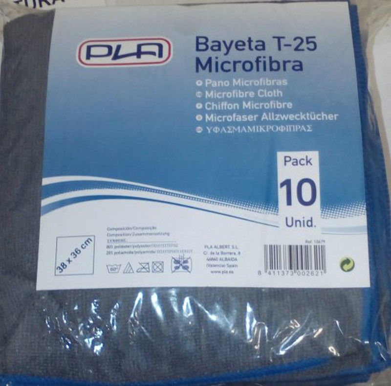 Bayeta de microfibra PLA T-25, ideal para limpieza de superficies delicadas. Paquete de 10 unidades de 36 x 36 cm, fabricada en microfibra de alta calidad para una limpieza eficaz y sin rayones. Perfecta para uso en hogar, oficina o automóvil. Color gris, diseño liso y fácil de usar.